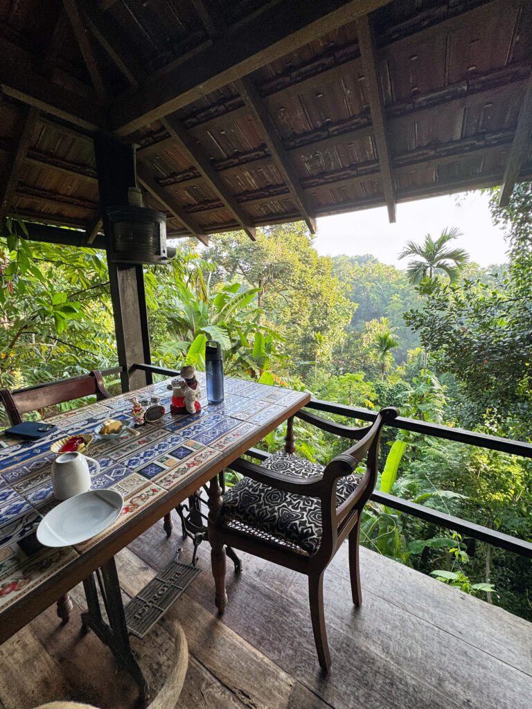 Home for our time in the area was a small heritage homestay perched on the hillside, a short drive from the city. A tranquil oasis of calm with gracious hosts, beautiful gardens, two perfectly adorable labradors, and a small restaurant teetering on stilts with the jungle cascading beneath it. Sitting here in the early morning, sipping our coffee and admiring the abundance of green below us, jackfruit trees, coffee plants and more, we listened to the chorus of birds and insects, with monks chanting in the distance, the call to prayer from a nearby mosque, and church bells layered alongside it all.