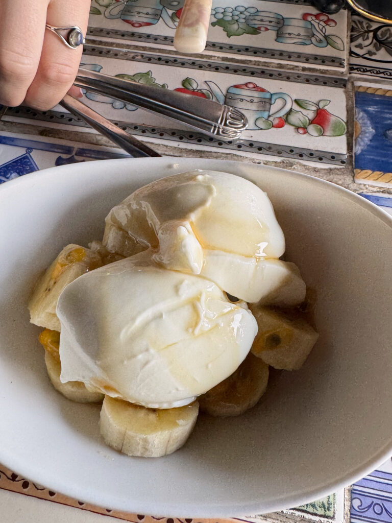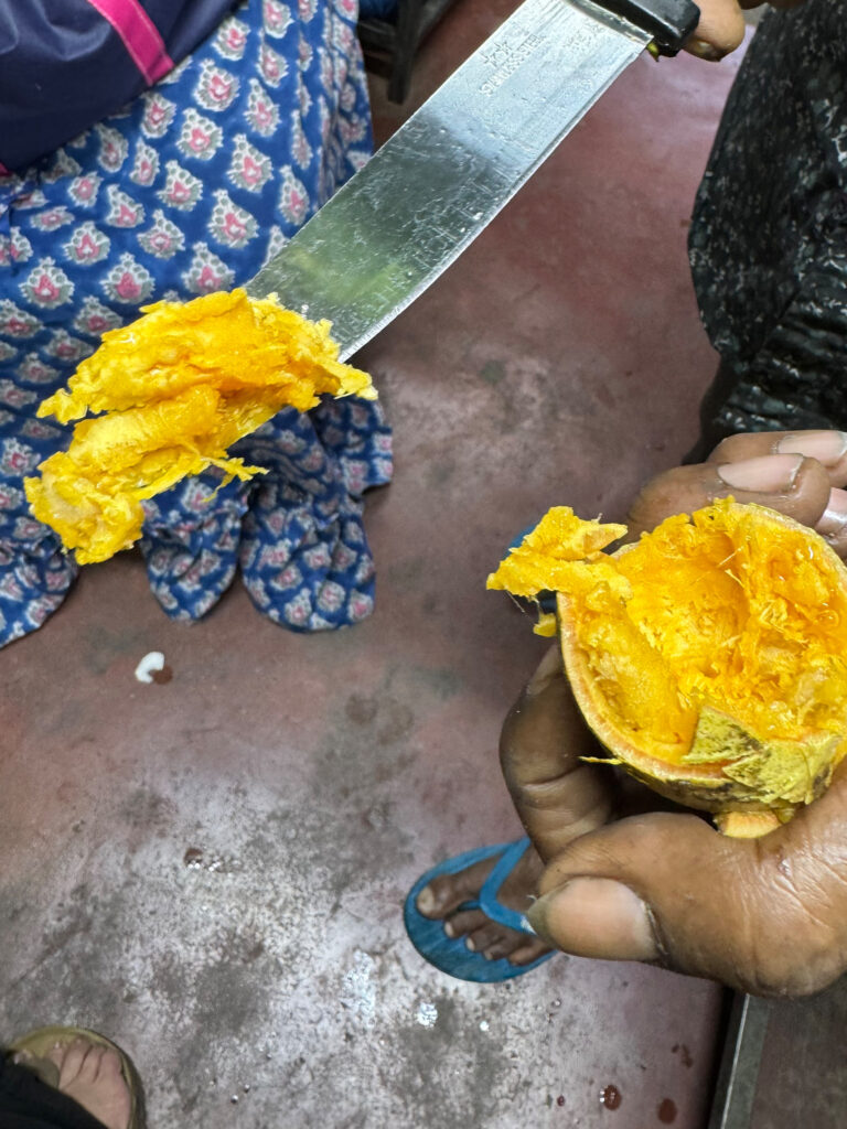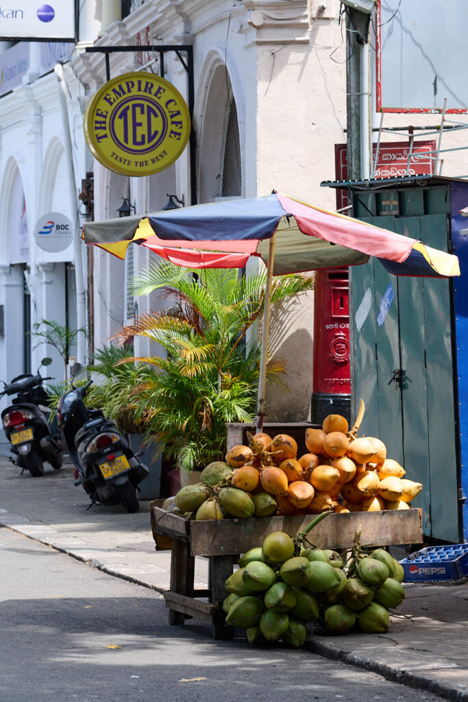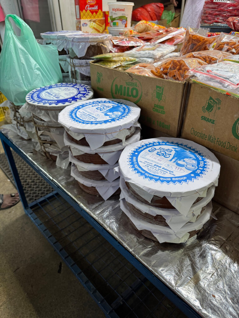 In preparation for the full day food tour we had ahead of us, our breakfast that morning was simple: delicious curd with fruit and kithul treacle, the syrup made from the sap of the kithul palm, a tall fishtail species native to Sri Lanka.