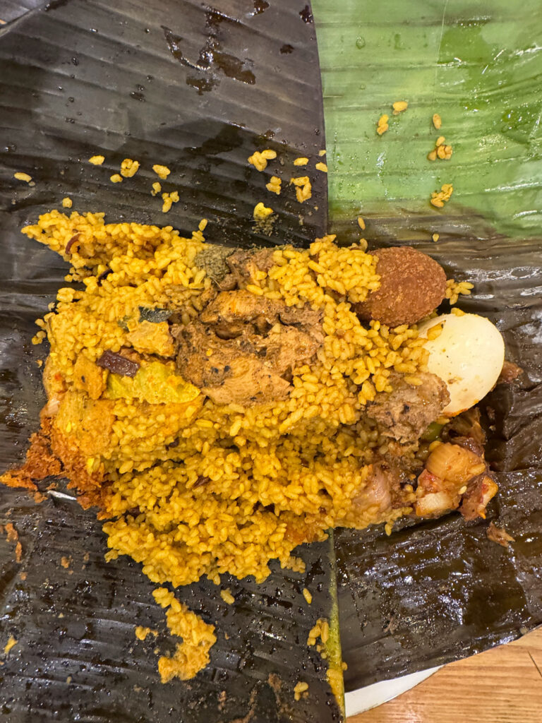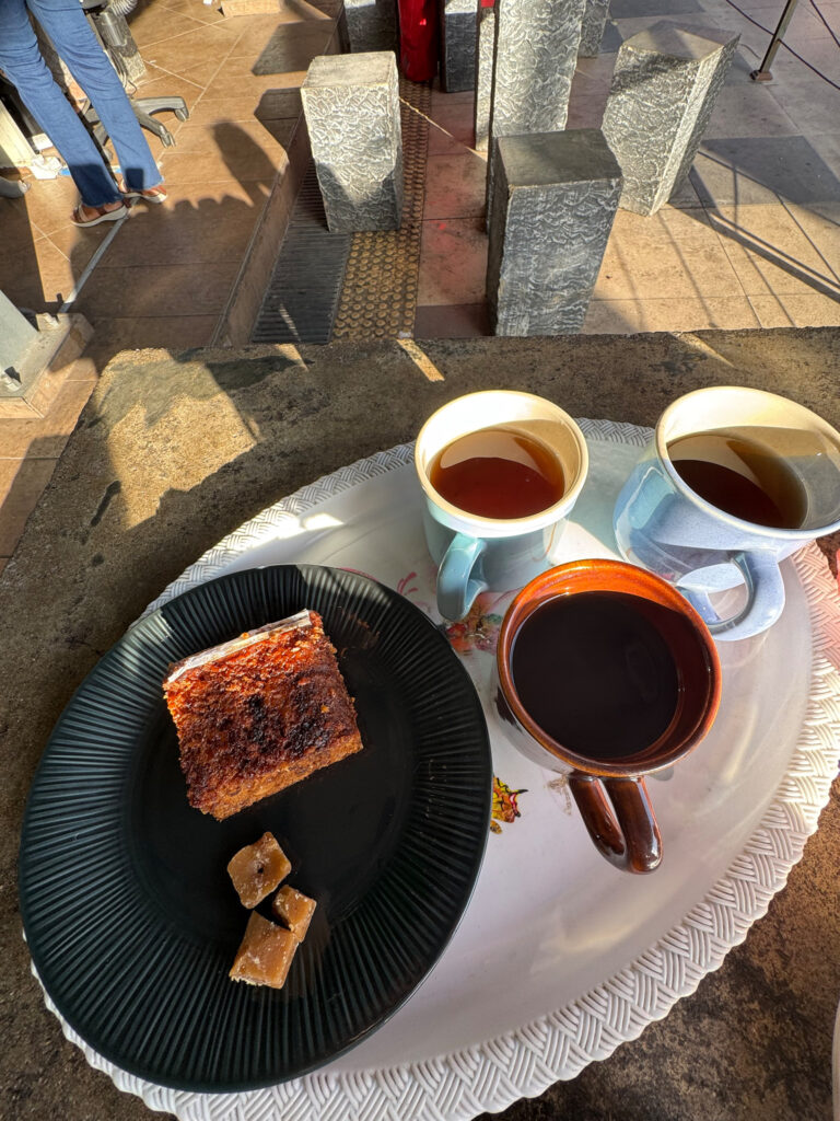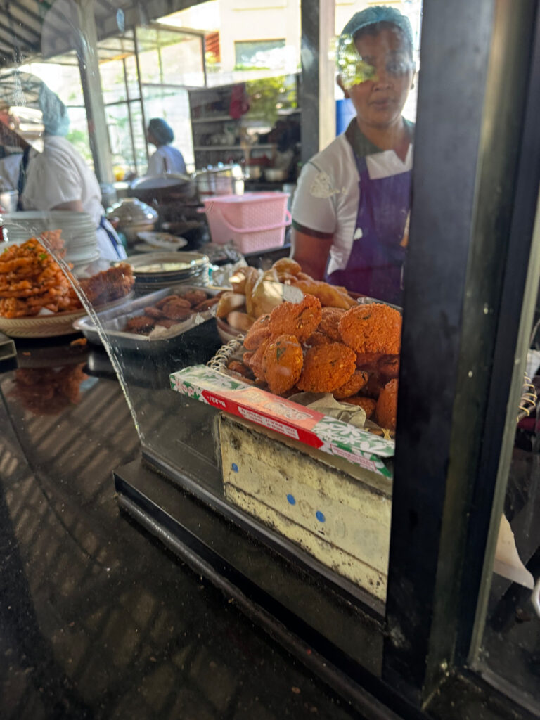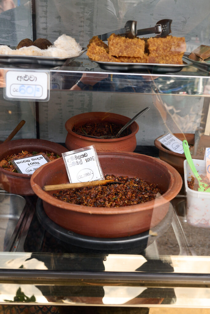 Our last meal stop — and the highlight of the day — was the Hela Bojun Hala outlet. These traditional food courts around Sri Lanka are run by local women offering authentic Sri Lankan dishes and are promoted as a way to support local economies and empower women. Buddhima piled the table high with a wide variety of dishes for us to taste. The flavours each different and exciting : samosas, vadas, puri and spicy chickpeas, puttu and dhal, millet rotis, an egg curry roll, and a delicious cake called bibikkan made from coconut, dates and treacle, alongside some herbal tea. A truly excellent place to savour Sri Lankan cooking.