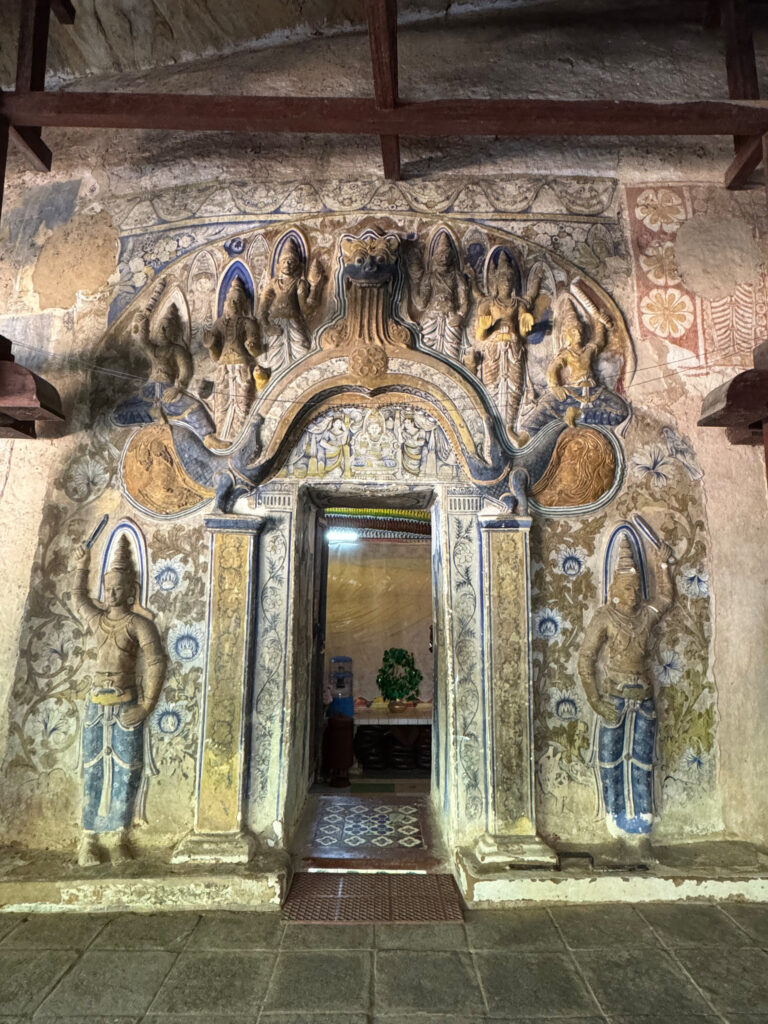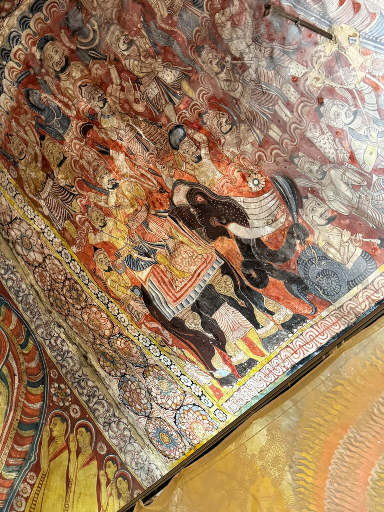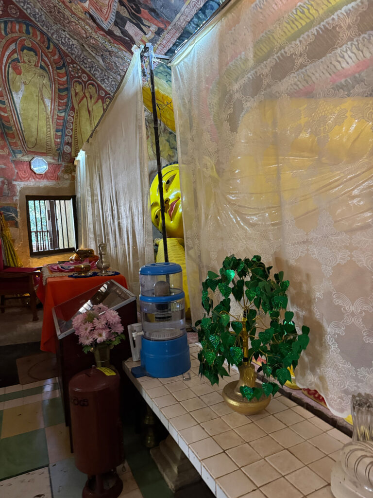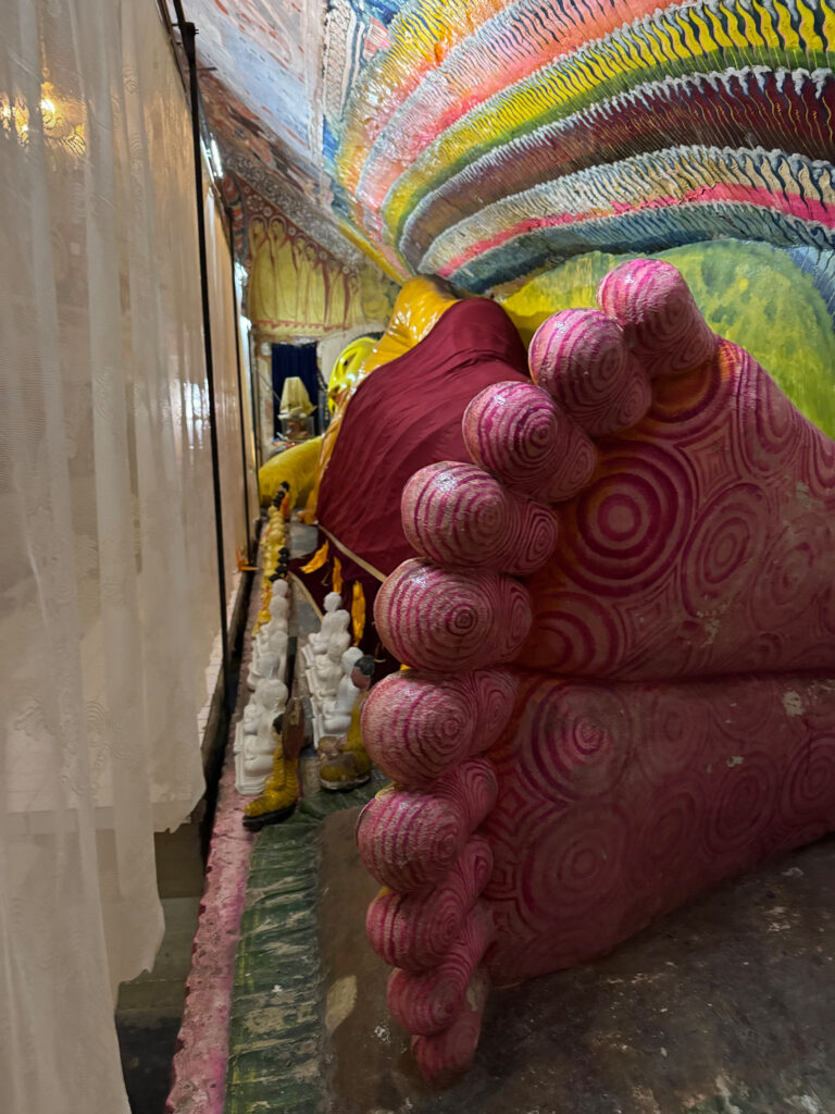 We left the city behind in our tuk tuk and tackled the steep hills, rewarded at the top with sweeping views. We climbed a set of equally steep stairs to a small cave temple, complete with mischievous monkeys who were very interested in anything we had in our hands. A betel chewing monk appeared and opened the shrine for us. Inside, the ancient painted walls glowed faintly in the filtered light, with the brightly coloured reclining Buddha tucked neatly into the curve of the cave.