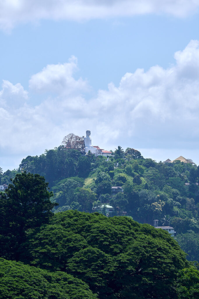 The hills are dotted with temples, including one crowned by an enormous Buddha statue watching over the city below, perched on a concrete platform.